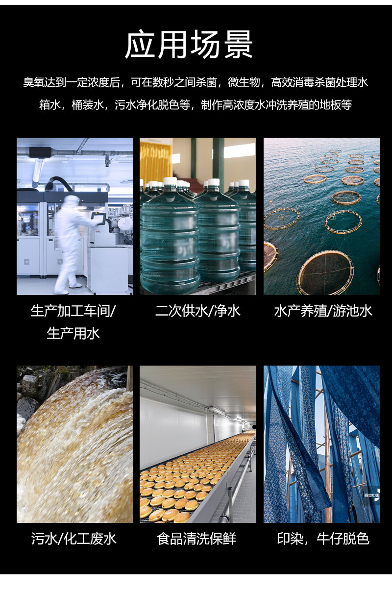 產(chǎn)品廣泛應(yīng)用于食品飲料企業(yè),清洗消毒礦泉水、純凈水、自來水等殺菌消毒,學校、部隊、機關(guān)、工廠等公共食堂對蔬菜、水果、肉類等殺菌消毒,水產(chǎn)養(yǎng)殖場對養(yǎng)殖用水殺菌消毒,防治水產(chǎn)類疾病,污水處理和垃圾處理中強化殺菌消毒氧化殺菌脫色,泳池、庫房、小區(qū)供水等用臭氧水殺菌消毒,對農(nóng)產(chǎn)品如蔬菜、水果等殺菌消毒,減少農(nóng)殘。
