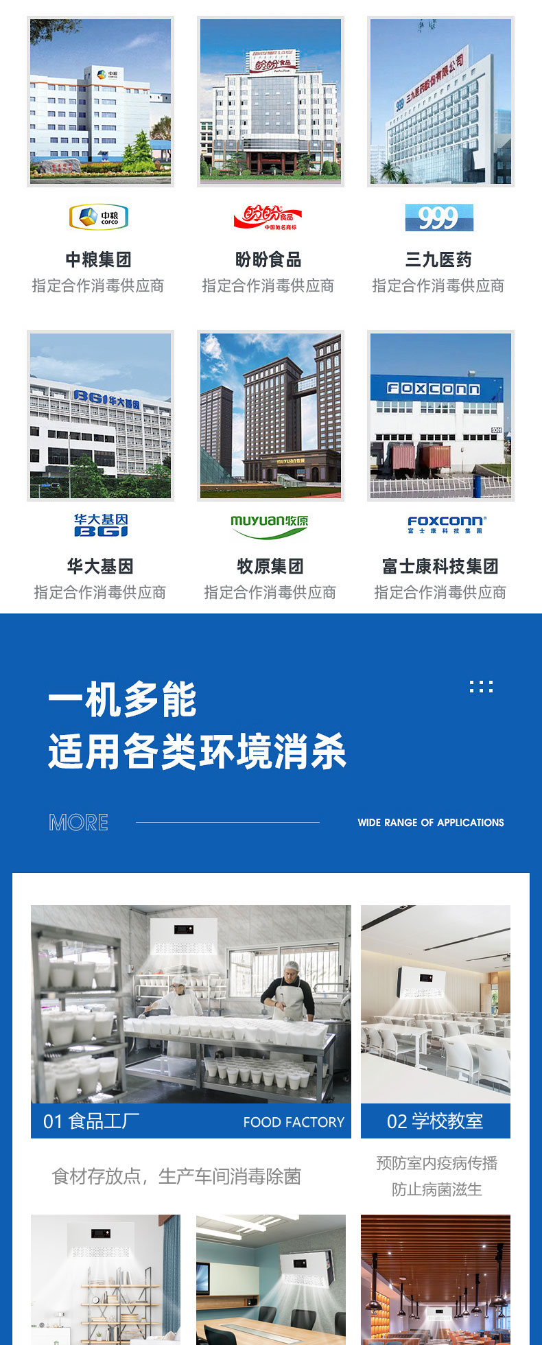 產(chǎn)品廣泛應用于食品加工等場所的空間消毒,化妝品加工、包裝車間、無菌室的消毒殺菌,水產(chǎn)品、冷凍、腌臘食品的表面除菌,生產(chǎn)設備及工器具的表面消毒,各種娛樂場所空間消毒。