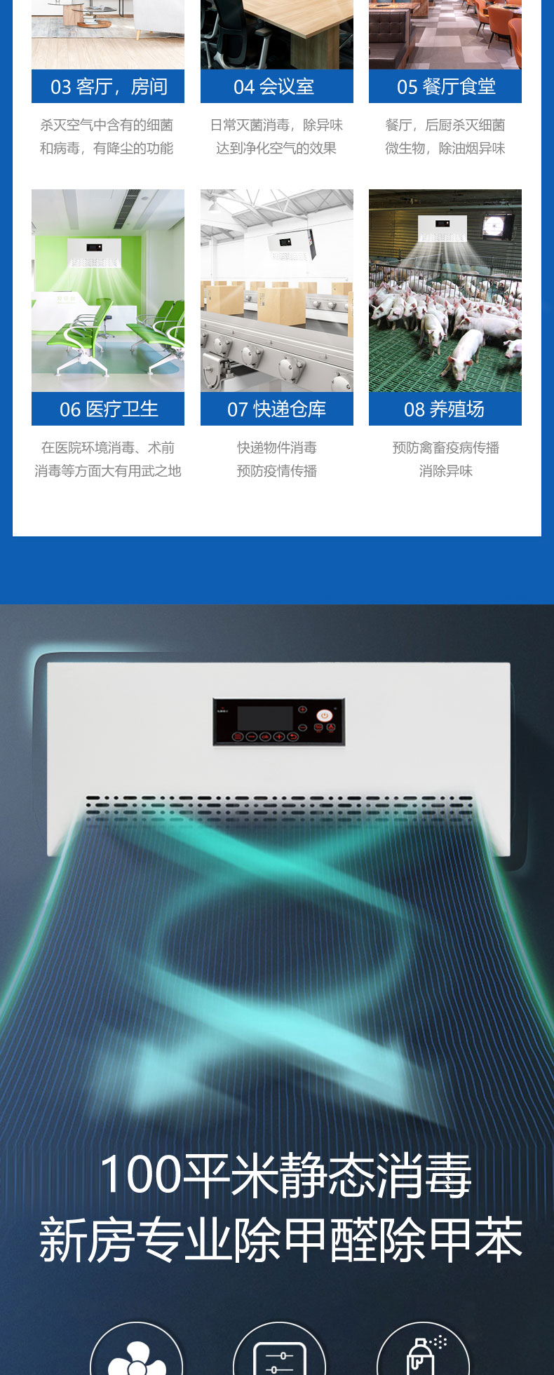 場合:幼兒園,冷庫冷藏,食品車間,GMP車間,制藥車間,學校教室,養(yǎng)殖場,垃圾處理站